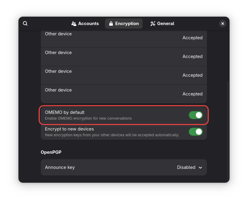 Tylko w ten sposób nasze wiadomości będą szyfrowane od końca do końca w trakcie konwersowania z naszymi znajomymi. Możemy też sprawdzić, czy przyszłe konwersacje będą szyfrowane, wchodząc do ustawień (trzy kreski tuż przy ikonce plusa w lewej części głównego okna Dino > „Preferences” > „Encryption”). Upewnij się, że opcja „OMEMO by default” jest zaznaczona, tak jak pokazano na poniższym zrzucie ekranu.