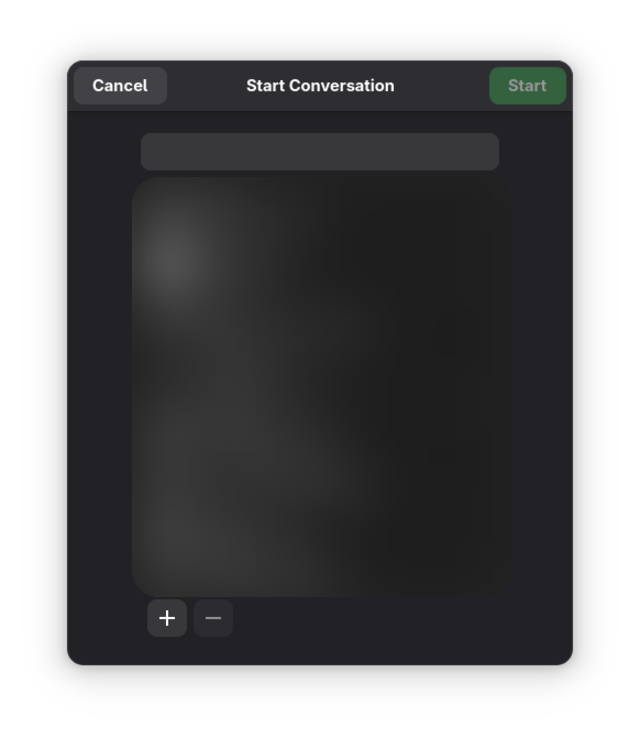 A co, gdy chcemy do kogoś napisać? Po zarejestrowaniu się klikamy w lewym górnym rogu na ikonę plusa i potem na „Start Conversation” (lub klikamy skrót klawiszowy Ctrl+T), żeby pokazało się nam okno wyboru kontaktu, i wciskamy Start.