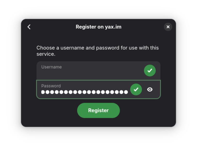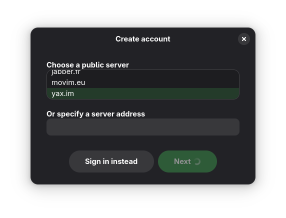 Monocles Chat sugeruje rejestrowanie nowych kont na swoją usługę XMPP lub na conversations.im. Nie byłem w stanie znaleźć prostego ustawienia, które zmienia to na jakikolwiek inny serwer (a jeżeli ono istnieje, to nie jest ono łatwo widoczne). Formularz logowania wspiera praktycznie każdy serwer XMPP, ale to nie jest to samo, gdy chcemy się… zarejestrować z poziomu aplikacji.