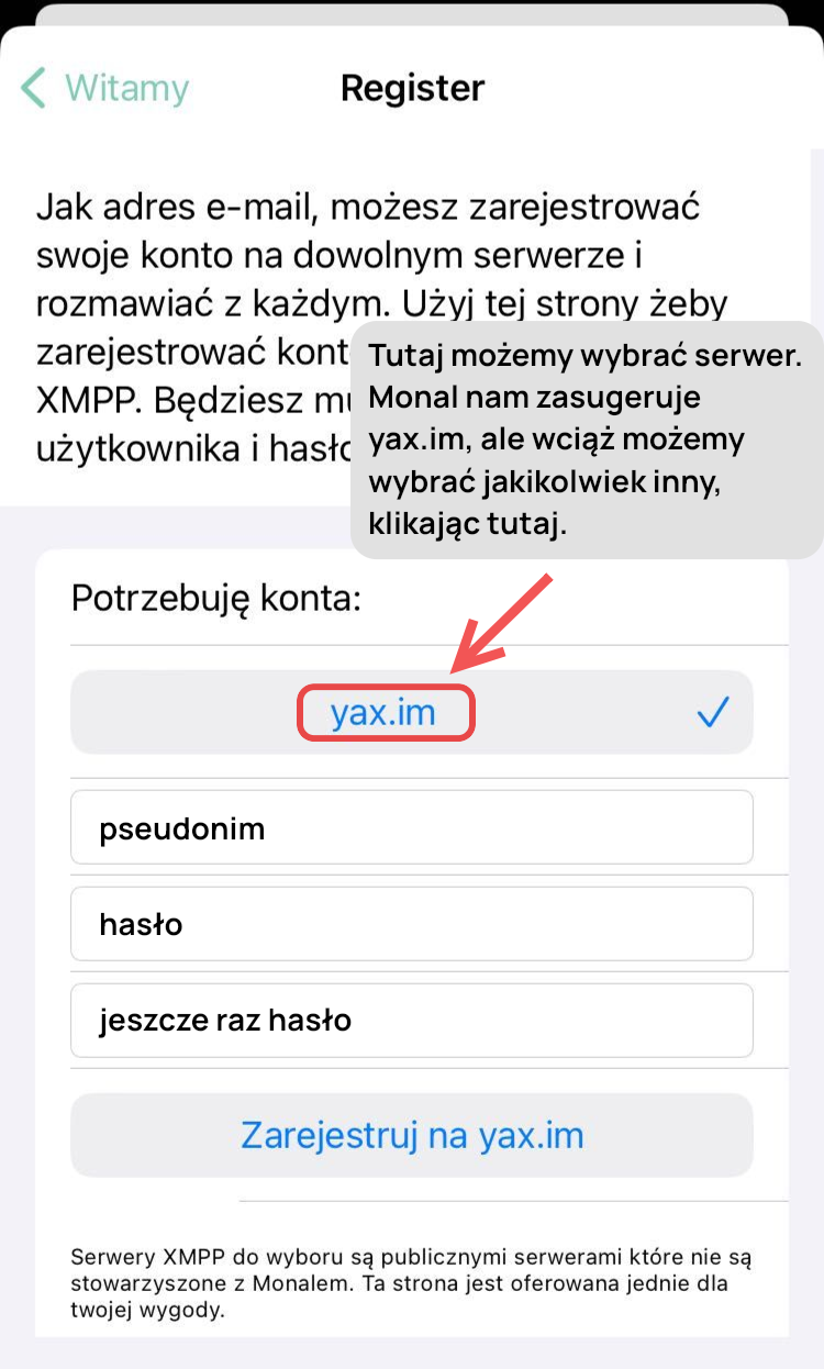 Dotarliśmy do formularza logowania. Klikamy na „Potrzebuję konta”, żebyśmy mogli zarejestrować swoje konto. Domyślnie aplikacja nam zasugeruje rejestrację na yax.im, ale możemy także wybrać jakikolwiek inny serwer, klikając na przycisk prezentujący nazwę serwera. Potem wpisujesz swój pseudonim i hasło — jak w większości usług internetowych. Skorzystaj z poniższego obrazka, żeby się wspomóc w trakcie rejestracji: