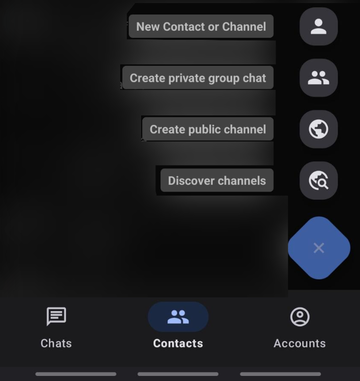 Jeżeli chcemy kogoś dodać, możemy to zrobić na dwa sposoby. Pierwszym z nich jest kliknięcie na ekranie głównym ikony ludzika z plusem i pozwolenie naszym znajomym na zeskanowanie kodu QR, który pozwala na dodanie naszego konta na XMPP do listy kontaktów naszych znajomych. Drugim z nich jest wejście do zakładki kontaktów, kliknięcie plusa w prawym dolnym rogu, i wybranie opcji „New Contact or Channel” („nowy kontakt lub kanał”).