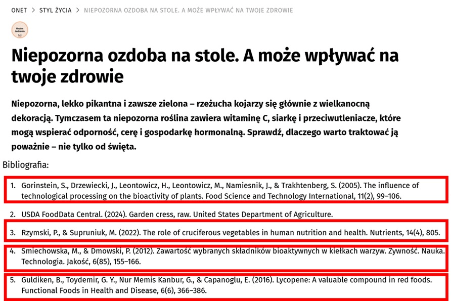 — Pod artykułem znajdowała się lista 5 źródeł, na których (rzekomo) miał być oparty tekst. Spośród nich cztery (podkreślone na grafice [poniżej — przyp. aut.]) to publikacje nieistniejące: nie ma takich artykułów opublikowanych przez wskazanych autorów, ani w wymienionych czasopismach, ani w jakichkolwiek innych — pisze Rzymski na Facebooku.