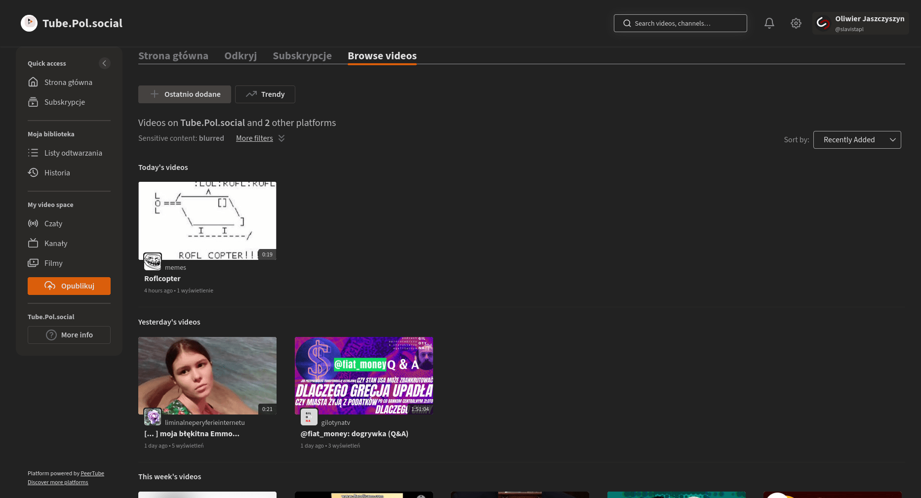 Dla porównania, strona główna wersji 7.2.3 PeerTube’a (na tube.pol.social) po polsku wygląda tak: