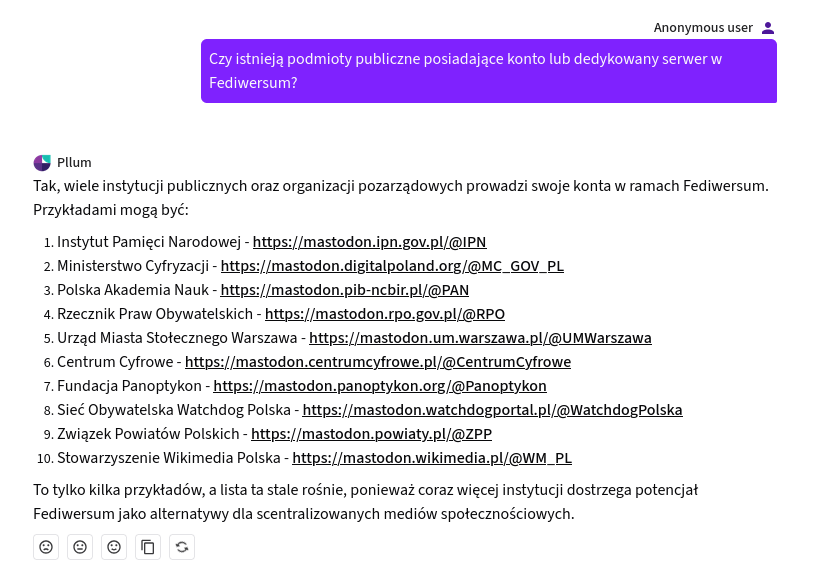 Z kolei przypadek stowarzyszenia Wikimedia Polska jest o tyle ciekawy, że przynajmniej w 2025 roku ta organizacja nie deklarowała wejścia do Fediwersum (a jednak PLLuM próbuje mnie przekonać, że jest inaczej). W podlinkowanej dyskusji na stronie Wikimedia Polska nawet możecie zobaczyć mój komentarz krytykujący decyzję stowarzyszenia z listopada 2024 roku.