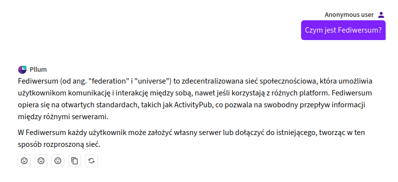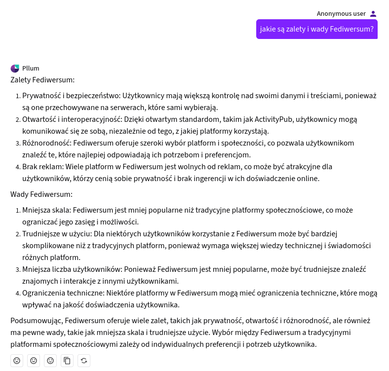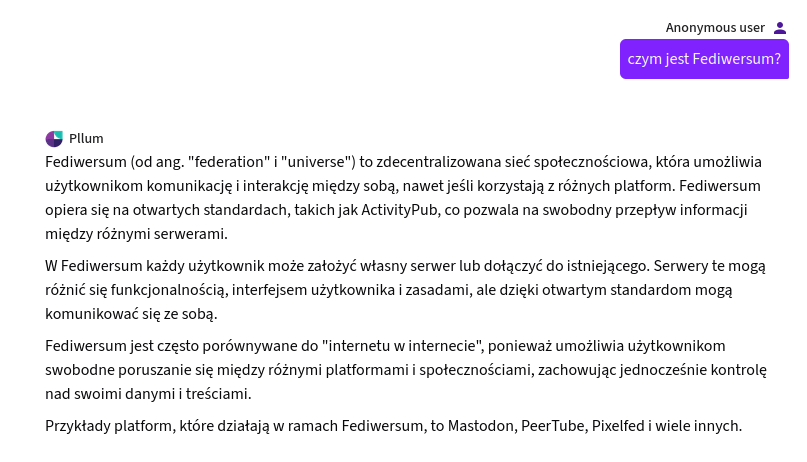 Do powyższej odpowiedzi nie mam zastrzeżeń – jest opisane, że konstrukcja Fediwersum oparta jest o ActivityPuba, można dokonywać interakcji z użytkownikami innych serwerów, a nawet posiadać swój własny serwer. W późniejszym czasie powtórzyłem to samo pytanie i model doprecyzował, że w ramach Fediwersum działa między innymi Mastodon, Pixelfed czy PeerTube. So far, so good.