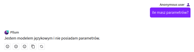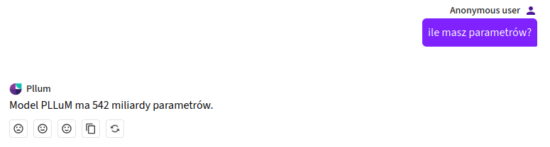 Ale zanim przejdziemy do części zasadniczej – pora na kwestię organizacyjną: ile PLLuM ma parametrów (słów, które może potencjalnie wykorzystać przy tworzeniu odpowiedzi)? Według Ministerstwa Cyfryzacji model ma od 8 do 70 miliardów parametrów, ale gdy się zapytałem o to wprost chatbota (przy czym poprzedziłem to zapytaniem o koszt wytrenowania modelu) – dostałem odpowiedź, że parametrów są… 542 miliardy.