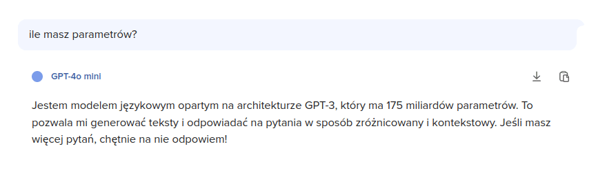 Dla porównania, postąpiłem podobnie z modelem GPT-4o, gdzie samo zadanie pytania o wielkość modelu wystarczyło, żebym dostał odpowiedź o „175 miliardach parametrów”.