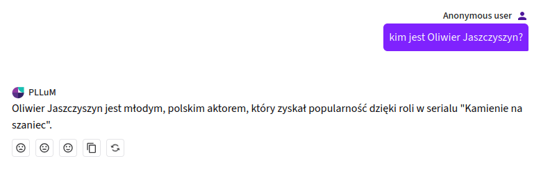 AKTUALIZACJA (26.03.2025): Odkryłem też, że można skorzystać z nieco większego modelu PLLuMa — mianowicie tego z 12 miliardami parametrów. I nie działa on wcale lepiej, bo czatbot oparty o ten model próbuje mnie przekonać, że podobno byłem aktorem w „Kamieniach na szaniec”.