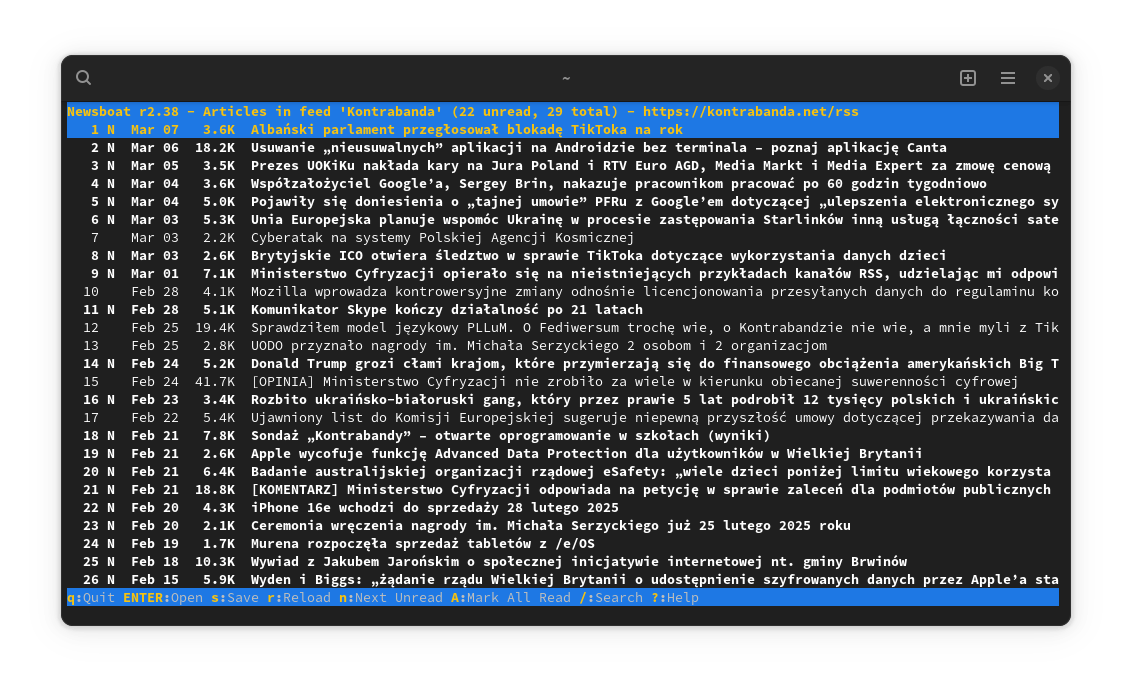 Korzystam z Newsboata, który jest dostępny na Linuxie, ale jest to jeden z wielu istniejących czytników RSS. Ponieważ w niekorpo-internecie jest niepisana zasada o szanowaniu wyboru użytkownika, każdy może preferować coś innego. Innymi przykładami mogą być: