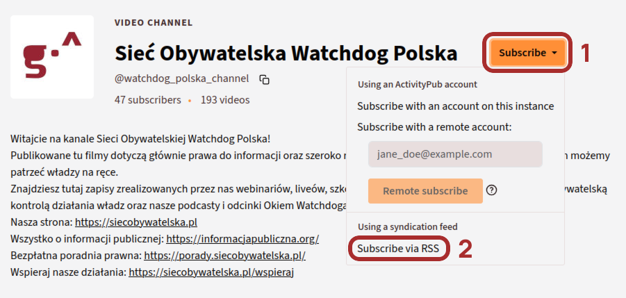 Jednak nie to nie jest jedyne oprogramowanie generujące kanały RSS na żądanie — innym przykładem może być Mastodon (wystarczy dopisać do adresu profilu użytkownika .rss – na przykładzie Urzędu Ochrony Danych Osobowych będzie to https://mastodon.com.pl/@UODO.rss), lub PeerTube (w przypadku, gdy nie subskrybujemy kanału bezpośrednio na PeerTube’ie, mamy szybki dostęp do takiego kanału):