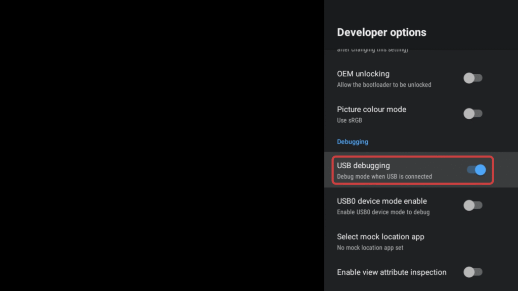 Aktywujemy potem ustawienie debugowania poprzez USB (w rzeczywistości nie trzeba będzie koniecznie korzystać z kabla USB, żeby podłączyć się do boksa, ale o tym za chwilę).