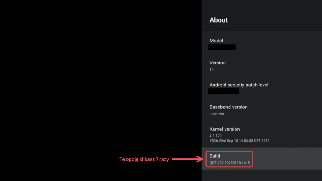 Będąc na tym ekranie, klikamy na opcję „About” (powinna wyświetlić się jako pierwsza), i następnie „schodzimy” na sam dół, w poszukiwaniu opcji „Build” (jako ostatnia w ekranie z informacjami o systemie). Należy ją kliknąć siedem razy, po czym aktywują się opcje deweloperskie.