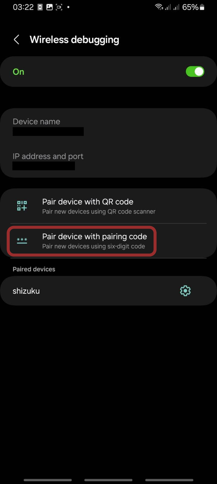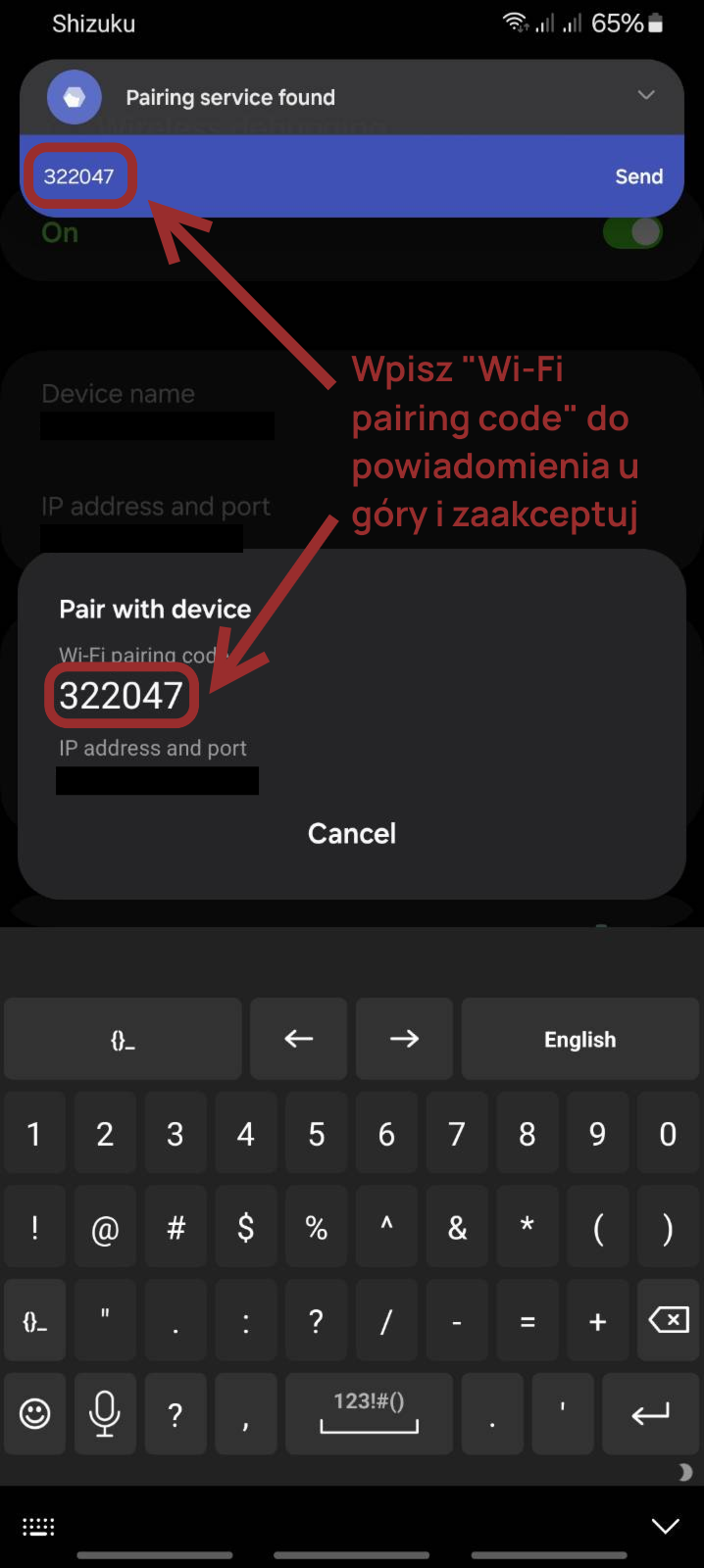 Po tym dokończ proces parowania za pomocą sześciocyfrowego kodu. Dotknij „Pair device with pairing code”, poczekaj, aż pojawi się odpowiednie powiadomienie (na którym klikniesz „Enter pairing code”), wprowadź kod do tego powiadomienia i zaakceptuj. Po maksymalnie kilku sekundach Shizuku powinien móc wystartować.