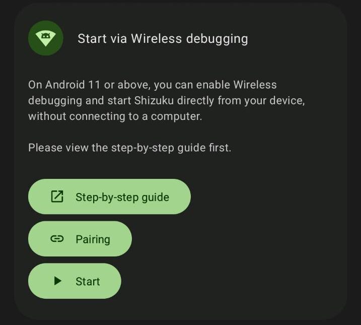 Gdy Shizuku odeśle z powrotem informację o treści „You can start Shizuku service now”, powróć do ekranu głównego aplikacji Shizuku i dotknij przycisku „Start”. Jeżeli Android odpowiedział powiadomieniem „Wireless debugging connected”, to całą konfigurację mamy za sobą i możemy iść dalej.