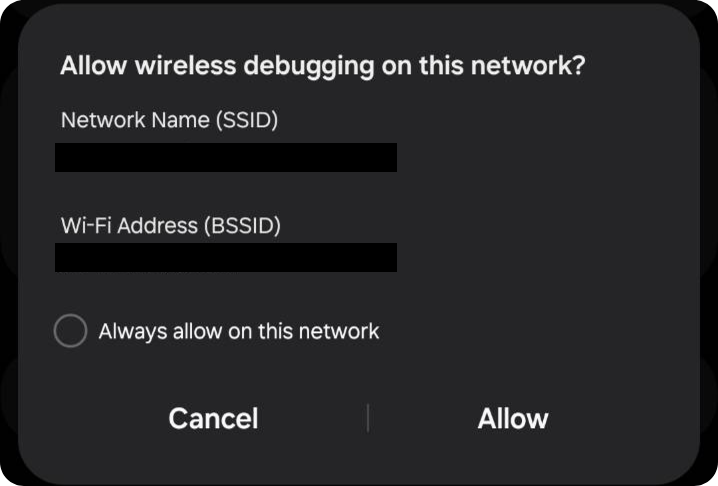 Wejdź w ekran debugowania bezprzewodowego i dopiero tam je włącz. Otrzymasz także zapytanie o akceptację wykorzystywanej przez Ciebie sieci WiFi do celów debugowania bezprzewodowego — zaakceptuj je. Powinno ono wyglądać (przynajmniej na Samsungach w poniżej przedstawiony sposób) następująco: