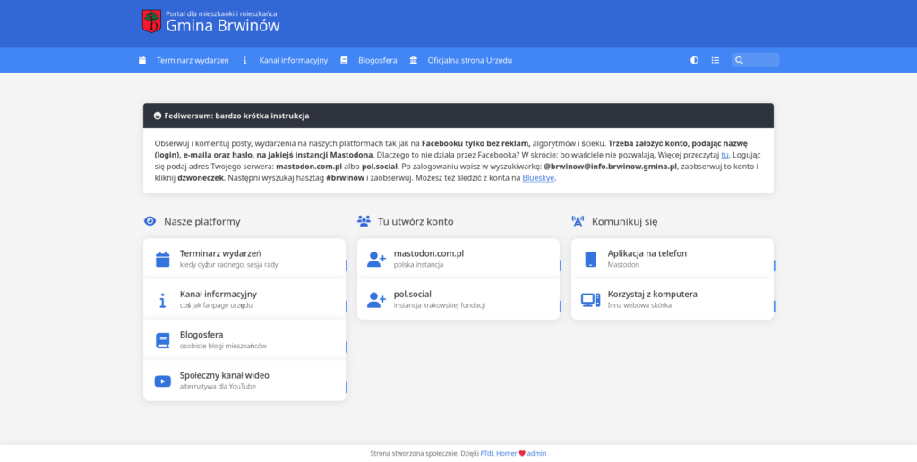 Pierwotnie nawet nie miałem zamiaru wychodzić poza zwykły terminarz wydarzeń w Brwinowie, jednak później uruchomiłem także własną instalację GoToSocial, na której można znaleźć kanał informacyjny, a zaraz potem dołączyła blogosfera, którą oparłem na oprogramowaniu WriteFreely. To wszystko ze sobą współgra dzięki protokołowi ActivityPub, który jest absolutną podstawą dzisiejszego Fediwersu. Wszystkie serwisy w ramach tej inicjatywy – a także instrukcje, jak dołączyć – zebrane zostały na stronie portal.brwinow.gmina.pl.